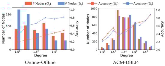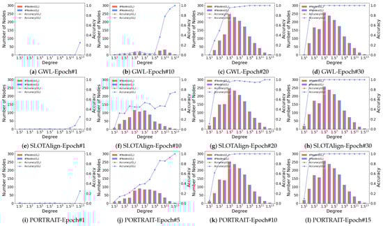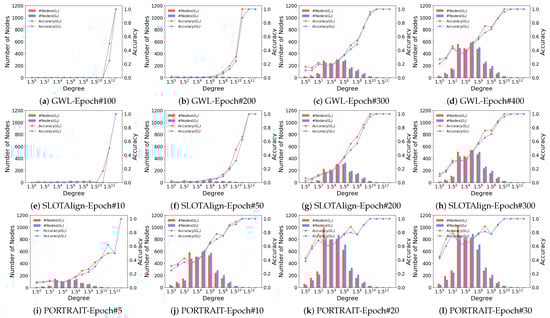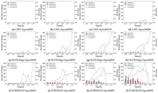 To further validate our motivation, we conduct a more detailed analysis of the OT-based graph alignment process across different datasets, and investigate the correlation between node degrees and the row-wise (column-wise) maximum alignment probabilities. Table 5 shows the average values for top-10% to 30% and the remaining nodes as well as the entire node set. It is clear that a strong correlation exists between the degree of a node and the predicted alignment probability, leading to higher accuracy. Meanwhile, we show the relationship between node degree and prediction accuracy (i.e., Hits@1) during the learning process. For ACM-DBLP, Douban, and PPI, we demonstrate the results of GWL (Figure 10a–d, Figure 11a–d, and Figure 12a–d), SLOTAlign (Figure 10e–h, Figure 11e–h, and Figure 12e–h), and PORTRAIT (Figure 10i–l, Figure 11i–l, and Figure 12i–l), respectively. It is obvious that nodes of large degrees are first aligned. Moreover, as the time costs per epoch for different OT-based methods are close, we conclude that PORTRAIT converges much faster than the other two baselines (also see Figure 9).