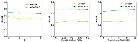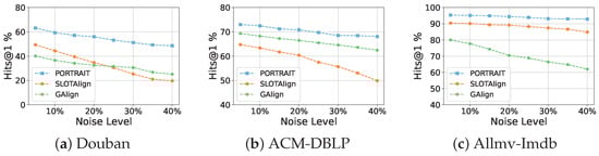 Figure 6. Robustness analysis in noisy conditions. - Parameter Sensitivity: We study the effects of hyperparameters on model accuracy, including the number of layers K in the attribute propagation step, the ratio of the pseudo-anchors, and the temperature parameter in the SCP module on the two real datasets. We use Hits@1 as the evaluation metric. The results are presented in Figure 7. By analyzing the impact of attribute propagation layers, a subtle decline in performance on the Douban dataset is noticeable with the increasing value of K. We speculate that this decline may be attributed to a certain degree of oversmoothing, potentially caused by the heightened number of layers. Interestingly, as the pseudo-anchor ratio increases, the model’s performance initially improves, followed by a slight decline. We attribute this phenomenon to higher confidence (92%) in pseudo-anchors within a smaller range; as the ratio grows, additional noise is introduced, which diminishes performance. Meanwhile, we observe a slight improvement in performance on the ACM-DBLP dataset as the temperature coefficient increases. In general, our model exhibits consistent robustness to variations of hyperparameters, highlighting the stability of our proposed approach.