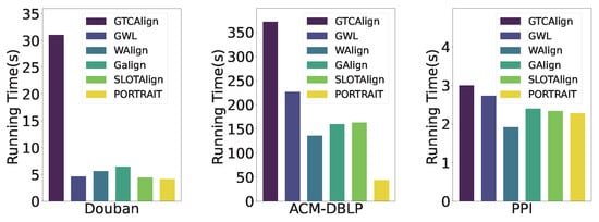 Recently, a line of optimal transport (OT)-based methods [,,] has been proposed for graph alignment, which demonstrates their advantages in prediction accuracy by formulating graph alignment as the OT problem. Generally speaking, given two probability distributions defined on the node sets, the OT algorithm (e.g., []) takes a non-negative cost function for node pairs as input and computes a probabilistic correspondence (referred to as the alignment matrix) so that the weighted total cost is minimized. Moreover, the alignment matrix must be a joint probabilistic distribution corresponding to the two marginal distributions for node sets. Therefore, the crux lies in the design of the cost function for node pairs, which is commonly implemented following the idea of Wasserstein distance (WD) [] and Gromov–Wasserstein distance (GWD) []. It has been demonstrated that the specific choice of the cost function has a great impact on matching accuracy. For example, state-of-the-art performance is obtained by considering graph structures and node attributes jointly [,]. Nonetheless, we note that the idea of integrating structures and attributes into the OT framework is still in its infancy, leaving a large room for improving both model accuracy and efficiency.