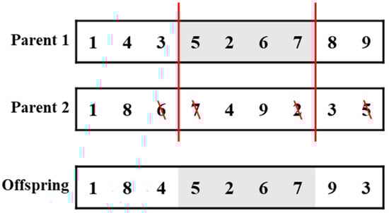 A two-point crossover operator [37] is employed as depicted in Figure 1. Initially, two parent chromosomes are selected using the roulette wheel selection mechanism. Subsequently, two crossover points are chosen at random. The segment between these points is inherited from Parent 1, while the remaining portions of the offspring are filled by sequentially incorporating genes from Parent 2. This crossover operation is performed with a probability denoted as . Accordingly, ceil ( offspring will be generated, where ceil (·) denotes the ceiling function that rounds up to the nearest integer.