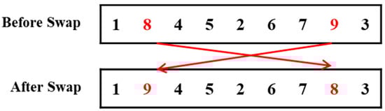 A swap mutation operator is employed, as illustrated in Figure 2. In this process, two surgeries are randomly selected, and their positions within the chromosome are swapped. This mutation operation is performed with a probability rate of .