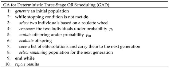 This subsection introduces the standard GA (GAD) developed to solve the deterministic three-stage OR scheduling problem. The objective is to minimize the makespan across all surgeries when the durations for each stage are known and fixed.