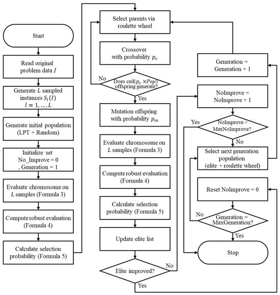 Building on this idea, a robust evaluation function is applied to evaluate the sequence ’s performance on a set of sampled problem data. Each sequence is evaluated a fixed number of times (L) and each time on a new sampled problem data . In this research, the objective function is makespan. Formula (3) indicates the value of sequence on one of the newly sampled problem data . Next, all evaluations are combined into a single robust evaluation function, as shown in Formula (4). To be used in the selection process, the robust evaluation value is then converted into a fitness value using Formula (5). This approach enables the GARS to identify schedules that perform reliably across a range of uncertain conditions. The calculations are as follows:
