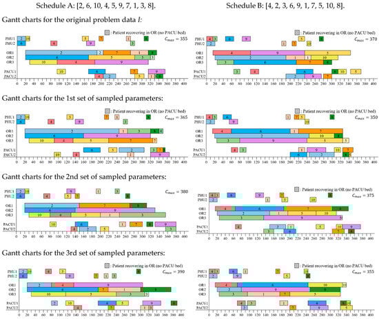 We first explain how to calculate the for Schedule A using the deterministic problem data set I. Please refer to the upper-left graph. The completion times of surgeries 1 to 10 at stage 3 are (330, 235, 335, 205, 305, 210, 290, 350, 355, and 115). According to Formula (1), the . Therefore, = max (330, 235, 335, 205, 305, 210, 290, 350, 355, and 115) = 355, which corresponds to the completion time of surgery 9 at stage 3. As shown in Figure 5, when Schedule A is subject to parameter variations, it often results in differing maximum completion times among the ORs. In contrast, Schedule B demonstrates more robust scheduling that effectively balances the completion times across all ORs under parameter changes, thereby reducing the of subsequent PACU bed usage. For the 1st set of sampled parameters in Schedule A, since surgeries 9, 7, 3, and 8 are all completed at almost the same time, there are not enough PACU beds, and surgery 9 takes a long time to recover. Therefore, surgeries 7 and 8 must occupy the OR for recovery. Although in Schedule B surgeries 7, 5, 10, and 8 are also completed at almost the same time, the recovery time of these surgeries is short, which has little impact on the time occupied by the PACU bed. Only surgery 5 occupies the OR for recovery. These four examples also illustrate that robust scheduling can reduce the average time ORs are occupied for recovery purposes, leading to improved utilization of the ORs. These observations help clarify why Schedule B performs better in the quantitative results shown in Table 3. The results indicate that Schedule A yields a smaller (355) on the deterministic instance than Schedule B (370). However, Schedule B (360.00) achieves better outcomes according to the robust evaluation function across the sampled scenarios than Schedule A (378.33). These findings suggest that, although Schedule A performs better under deterministic conditions, Schedule B is more robust, as it is less sensitive to data uncertainty. This example illustrates our objective of identifying a robust schedule that maintains stable performance despite uncertainty.