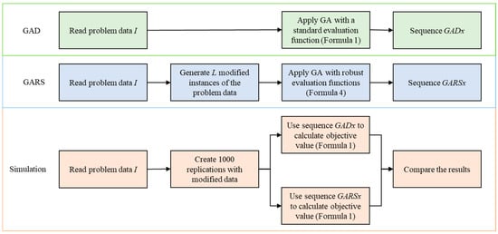 Moreover, the performance of the proposed algorithm is evaluated using a simulation procedure similar to the one employed by [38]. We first run the GAD on the original problem data I using the standard evaluation functions (Formula (1)). The results obtained are called sequence . Next, we run the GARS on sampled problem data using the robust evaluation function (Formula (4)). The results obtained are called sequence . Once these two sequences are obtained, 1000 replications of the problem instances with randomly modified problem data from I according to the degree of disturbances are carried out to simulate the two obtained sequences. Figure 6 shows the simulation procedure of two GAs.