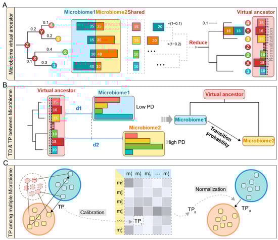 For two microbiomes, MT-tracker reconstructs their virtual common ancestor by mapping their community members onto a shared phylogeny tree. The virtual ancestor microbiome comprises two components: shared microbes (i.e., tip nodes in the phylogeny tree) and virtual microbes (i.e., internal nodes). Initially, the ancestor microbiome is empty. For each shared microbe (e.g., microbe 4 in Figure 2A), the common component is extracted by taking the minimum relative abundance (i.e., the proportion of each microbe’s abundance relative to the total abundance within a microbiome) between the two microbiomes. This value is added to the ancestor microbiome. The remaining abundance of this microbe is then reduced to its ancestor internal node (e.g., node Y in Figure 2A), weighted by 1-distp (the evolutional distance to the ancestor internal node in the phylogeny tree). Using a post-order traversal of the phylogeny tree, all nodes are processed recursively to construct the virtual ancestor microbiome. This approach ensures that the richness of each community member is accurately parsed and normalized, resulting in a comprehensive representation of the ancestor microbiome. Biologically, the virtual common ancestor microbiome represents an inferred community that approximates the minimal common origin of two communities. By calculating the phylogenetic distances of both microbiomes to this reconstructed ancestor, we can infer the likely direction of transition between the two communities.