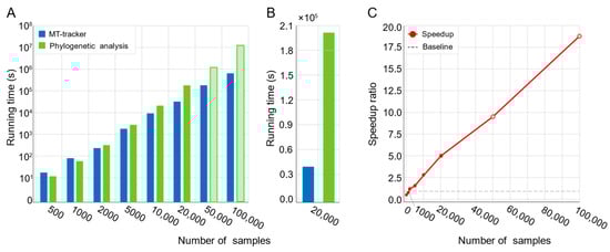 Computational efficiency comparison between MT-tracker and phylogeny tree-based method. (A) Running time of both methods across sample sets of varying sizes. Hollow bars indicate estimated values due to excessively long computation times. (B) Direct comparison of running time for dataset containing 20,000 samples. (C) Speedup ratio of MT-tracker relative to phylogeny tree-based method across different sample sizes. Hollow dots represent estimated values due to extended computation times.