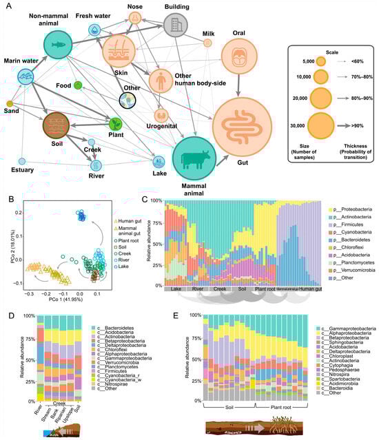 The transitional direction of global microbiomes across ecosystems. (A) Nodes represent microbial communities in different habitats. The size of each node represents the number of samples from the corresponding habitat, while the thickness of the directional arrows indicates the probability of transition between habitats. (B) The principal coordinate analysis (PCoA) diagram was constructed using 140 microbial groups from seven habitats. The arrows indicate the direction of transition. (C) The transition of microbial groups from lakes to human intestinal habitats at the phylum level. (D) The transition of microbial groups between rivers, streams, and soil habitats at the class level. The stream habitat includes four locations: stream, bank, riparian, and upslope. (E) The transition of soil microorganisms and plant root microorganisms at the class level.