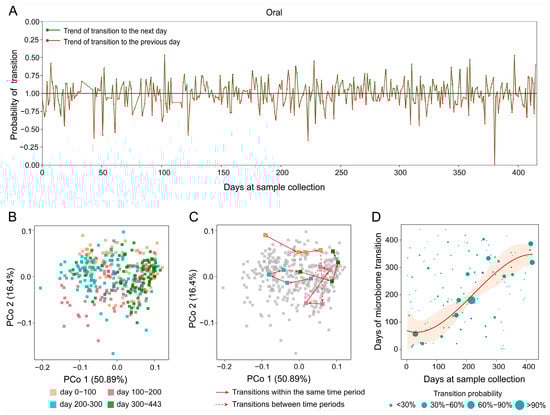 The transition trend of oral microbiome in subjects over time. (A) The short-term transition trend shows the red and green dashed lines representing the daily transition, with the positive and negative on the vertical axis indicating the direction of transition. (B) A PCoA diagram of oral sample microorganisms. (C) Illustrates the transformation path by connecting sample points according to sampling time. (D) The trend of oral microbiome transition over time. The horizontal axis represents sample collection time, while the vertical axis indicates the target time point for microbiome transition. The size of each data point reflects the probability of transition, with larger points indicating higher probabilities.