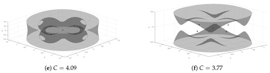 The geometry of the ZVSs changes with the variation of some specific parameters, such as C and . Each of these parameters is essential for defining the structure and evolution of these surfaces. On the one hand, for each value of N, there is a bifurcation value of the mass parameter, , denoted as , which produces a change in the number of stationary solutions in the system from to , and also causes changes in the geometry of the ZVSs [43]. In Figure 1 and Figure 2, we illustrate several examples of the different ZVS shapes that may occur in the scenarios with and stationary solutions, respectively. Moreover, it is also known that there are more bifurcations or critical values of that affect the geometry of the ZVSs [8,10].