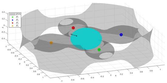 The sample of initial conditions is selected such that the initial positions lie on the surface of section defined by the boundary of a sphere inside the ZVS, with a fixed radius , denoted here as , and the initial velocity is assumed to be perpendicular to the tangent plane of the sphere for each initial position and such that its modulus is derived from the integral of Jacobi (Equation (3)). The set of initial positions is defined on a grid of points uniformly distributed in the region of the hyperplane , where and are the angles defined in spherical coordinates. Thus, the initial conditions, , are taken in the following domain: