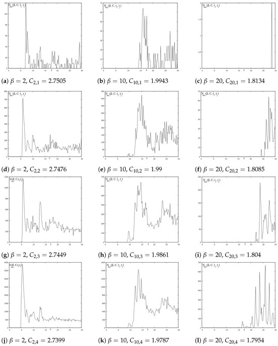 A general overview of all the results evidences that when , the highest peak increases directly and also declines suddenly to the lowest value, while for , the increase in the highest peak and the decline occur gradually, accompanied by the emergence of many secondary peaks. However, for , the peaks appear separately, following a sequential pattern.