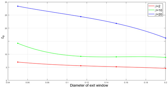 In Figure 6, we depict an estimation for the initial time, , at which the orbits start to escape from the potential well with the variation of the diameter of the opening windows, , for each case of , by means of a polynomial interpolation. We conclude that when the mass ratio, , increases, the initial time of escaping, , increases concurrently, which means that the orbits need more time to escape as the mass ratio increases. This behavior is directly related to the fact that is the ratio between the central mass and the peripheral masses. Furthermore, as the Jacobi constant decreases, the initial time, , decreases. This fact obviously indicates that orbits start escaping faster because the diameter of the opening windows becomes larger. We can deduce that the mass ratio, , and the Jacobi constant, C, generate distinct changes in the distribution of the escape.