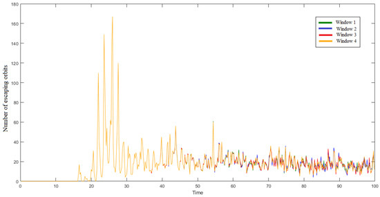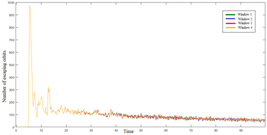 In Figure 7, Figure 8 and Figure 9, we illustrate the number of orbits that escape from each of the four openings, for and , such that the results of Windows 1, 2, 3 and 4 are colored in green, blue, red, and yellow, respectively. We can observe that for the pair , , the four curves overlap in the interval of time , and for , , they overlap in the interval of time , while for and , the interval of time is extended to . It is evident that the time of fast escape for each case is significantly increased with the increase in and the decrease in C.