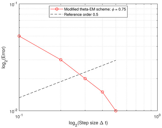 for . Taking , and , we plot the numerical results in the following figure. From Figure 1, we can observe that the convergence of the modified stochastic theta scheme is close to the theoretical prediction.