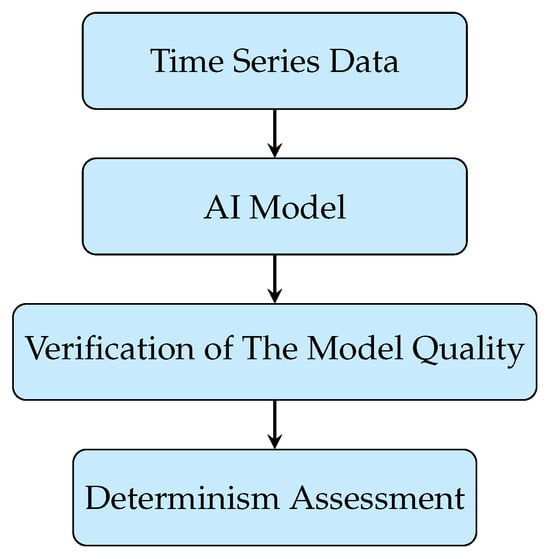 However, deep learning methods have recently allowed stating a more general method of the determinism estimation of a time series. Deep learning methods are, in fact, algorithms that are deterministic on one side and capable of being trained on the data provided. The quality of the trained model depends on several factors. However, one key feature is the existence of some deterministic patterns among the data discovered during the training stage. Of course, the model is not always satisfactory. Besides the possible mistakes in the model design, the main reason is the randomness of the analysed data. This feature allows designing a more general tool than the existing time series models for the determinism measure method. The main idea of the proposed methods is to use the quality of the trained model as a measure of the determinism of the time series. The capacity of AI models to reconstruct a wide range of time series suggests the potential for verifying the determinism of the analysed data. In this study, a novel method for assessing determinism is proposed. This method is based on the quality of the AI model trained on the time series data. It is hypothesised that highly deterministic time series will be reconstructed with high accuracy. In contrast, models trained on stochastic time series will demonstrate poor concordance with the time series. Due to the inherent characteristics of AI modelling, it is not feasible to provide a mathematical proof of the quality of the methods. The scheme of the proposed approach is presented in Figure 1. The discussion of the possible AI models and reasoning for the model choice are provided in Section 2. This paper verifies the possibility of establishing such a measure of determinism of the time series. The hypothesis is verified on the chosen examples and is performed in three classes of models: (i) deterministic time series models with a stochastic component; (ii) deterministic systems—however, in this case, the chaotic models will be used; (iii) real, stochastic models.