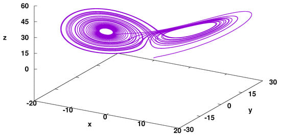 The deterministic chaotic models [40] are the systems, where despite purely deterministic evolution, the prediction of the state is impossible due to the sensitivity to the initial conditions. One such system is the Lorentz Attractor defined by Equation (12). Lorentz presented the system in [41]. More detailed analysis of the Lorentz Attractor can be found, e.g., [42,43]