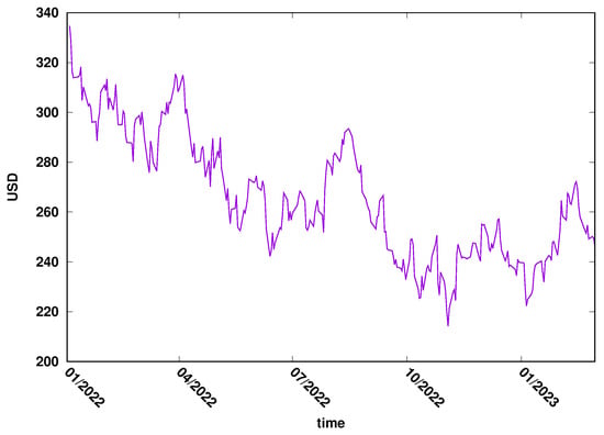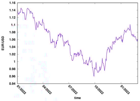 This study used two time series: the daily close exchange rate of USD/EUR (FOREX market) and Microsoft’s daily close price (MSFT) of the New York stock exchange. The most important features that determined the choice of the examples were the liquidity of those markets and their importance to the global market. The data were downloaded from the Yahoo Finance web page, covering 2022/2023. The evolution of EUR/USD is presented in Figure 3, while the evolution of MSFT daily close price can be seen in Figure 4.
