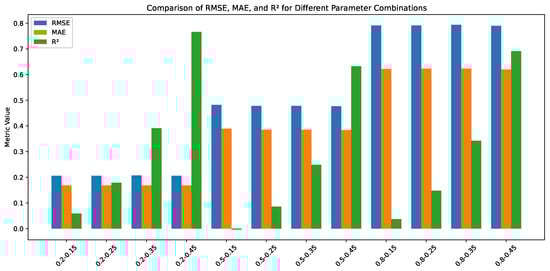 Grouped bar plot comparing RMSE, MAE, and values for the AR(2) time series for different combinations of and . Each group of bars represents a unique parameter combination.