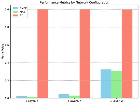 Grouped bar plot comparing RMSE, MAE, and values for the Lorentz Attractor time series: one-layer and two-layer networks for X and Z coordinates.