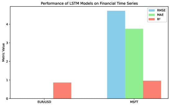 Grouped bar plot comparing RMSE, MAE, and values for one-layer LSTM models trained on the EUR/USD and MSFT financial time series. RMSE and MAE for the EUR/USD exchange rate are hardly visible due to the scale of the graph.
