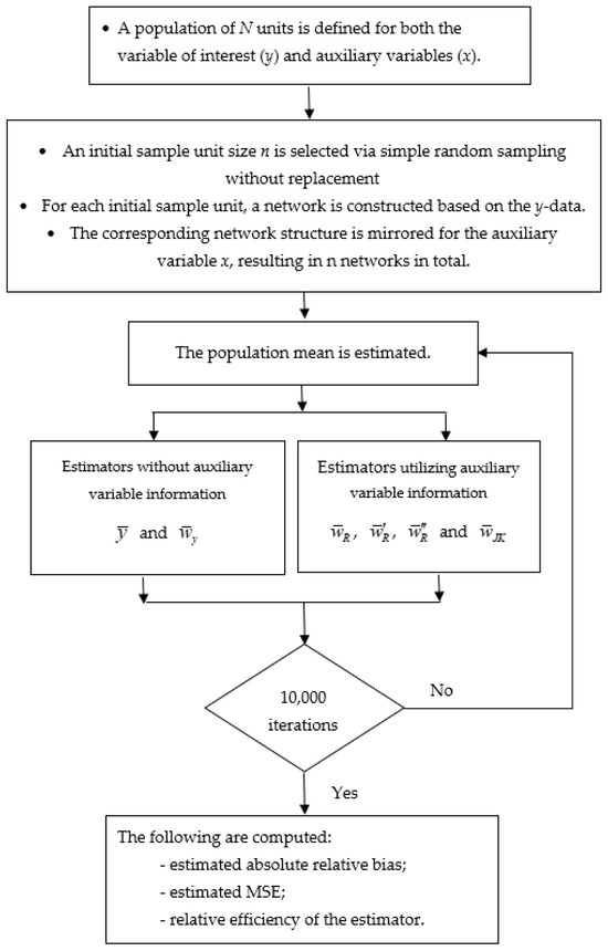 The flowchart in Figure 2 outlines the simulation procedure, while the estimated absolute relative bias, estimated mean square error (MSE), and relative efficiency of the proposed estimators are presented in Table 1, Table 2 and Table 3. Additionally, bar charts in Figure 3 illustrate the behavior of the estimated MSE across various initial sample sizes.