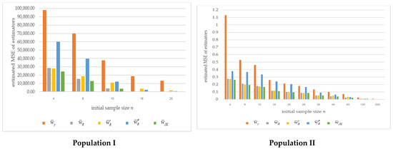 Table 2 shows that the estimators incorporating auxiliary variable information—given the positive correlation with the variable of interest—consistently yielded lower MSEs than estimators that do not use such information. Notably, achieved a lower MSE than the traditional ratio estimator when the initial sample size was small. Among all estimators, provided the lowest MSE across all initial sample sizes. Although the estimator is unbiased, its MSE was higher than that of despite being lower than that of estimators that do not use auxiliary information. As illustrated in Figure 3, the MSE for all estimators decreased as the sample size increased. Table 3 reports the relative efficiency of each estimator compared with that of and . Notably, all estimators that incorporate auxiliary variable information demonstrated higher relative efficiency than across both Population I and Population II. Among them, the estimator consistently exhibited the highest relative efficiency.