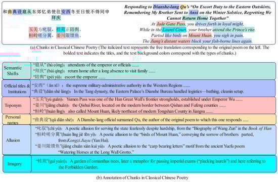 As shown in Figure 1a, due to the substantial linguistic divergence between classical Chinese poetry and modern Chinese, poems frequently contain various semantic chunks, such as allusions, metonymy, semantic shifts, and the names of official titles and institutions [1]. The meanings of these chunks often cannot be interpreted literally, and some terms are no longer in use in contemporary Chinese. Consequently, modern readers often face considerable challenges in reading and understanding classical poetry, which significantly impedes its broader accessibility and cultural transmission [2,3].