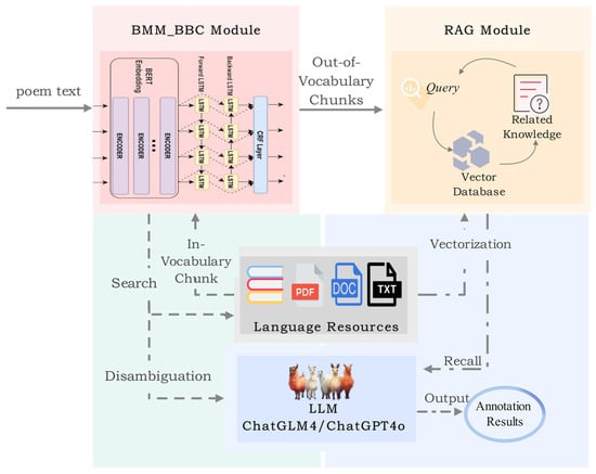 In our workflow, manual chunk selection—without genuine understanding of each chunk’s meaning—fails to guarantee correct segmentation and cannot scale to large-volume annotation. Therefore, we first apply the BMM_BBC Chunking Module to segment the input poem automatically. For each resulting chunk, we query a curated lexical resource: if dictionary definitions exist, we pass the chunk and its candidate senses into the LLM for disambiguation; if a chunk is not found in the dictionary (i.e., out-of-vocabulary), we invoke our retrieval-augmented generation (RAG) module to retrieve relevant domain knowledge and generate an optimal annotation.