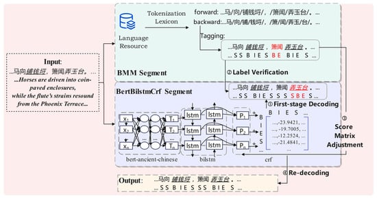 where the increment δ is determined by the rule set in Formula (7). This adjustment encourages the CRF decoder to favor segments that align with dictionary-based priors while still allowing the BBC model’s contextual understanding to resolve ambiguous cases.