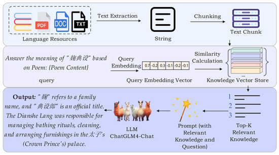 The integration of the RAG module is motivated by two considerations. First, in classical Chinese poetry, certain chunks may not appear in existing lexicons or language resources, rendering traditional dictionary-based methods unable to supply definitions. By querying external repositories, RAG effectively bridges this gap. Second, although large language models excel at processing lengthy texts and complex contexts, their outputs can lack precise grounding in domain-specific knowledge—such as literary allusions and historical backgrounds. By incorporating retrieved facts and examples into the generation process, the RAG module substantially improves both the accuracy and reliability of the resulting annotations. Figure 4 illustrates the workflow of the Retrieval-Augmented Generation (RAG) module, which integrates external knowledge to enhance response generation.