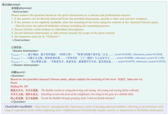 The re-ranked context set Crerank is then combined with the original query to construct a prompt, which is subsequently passed to a large language model to generate the final output. Figure 5 illustrates an example prompt generated by the RAG module in this study. The “Known Information” section corresponds to the re-ranked context set Crerank, while the initial retrieval scores (i.e., pre-re-ranking similarity scores) are denoted as score. After applying the re-ranking model, frerank, each candidate document receives a new relevance_score based on its semantic alignment with the query, which leads to a refined ranking. For example, although the chunk Crerank-3 does not contain information relevant to “小儿相” it initially received the highest semantic similarity score (0.6479) in the preliminary retrieval stage. However, after re-ranking, its relevance_score drops to 0.0725, demonstrating a more fine-grained and semantically aware relevance evaluation.