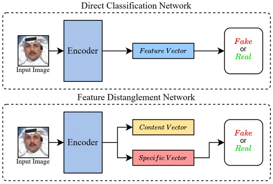 Comparison between the Direct Classification Method and the Feature Disentanglement Method. The direct classification network transforms the input data into feature vectors and directly conducts classification. The feature decoupling network strips away the content features that are irrelevant to forgery detection and focuses on the concealed forgery features in the image so as to prevent overfitting and enhance the generalization ability of the model.