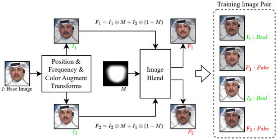 Given a real input image I, we generated image pairs (, ) with statistical inconsistencies by applying diverse data augmentation techniques to I. These data augmentations included randomly altering the RGB channel values of the input image, along with color transformations such as changes in hue, saturation, value, brightness, and contrast. Subsequently, frequency transformations were implemented using sampling or image sharpening. The image pairs were subjected to resizing and translation operations to reproduce blending boundary and landmark mismatches. These methods generated image pairs (,) exhibiting color differences and landmark disparities from a single real image.
