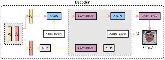 Decoder architecture. The content feature and the forgery-related feature are jointly input into the AdaIN [35] (Adaptive Instance Normalization) module. Then, the process of the Conv-Block, the upsampling layer combined with the MLP auxiliary structure, is repeated twice. Relying on the cooperative work of multiple modules, finally, the deepfake reconstructed image is decoded and output through the Conv-Block.
