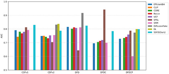 Cross Domain Detection Performance Comparison: AUC results on CDF, DFD, DFDC, and DFDCP datasets.