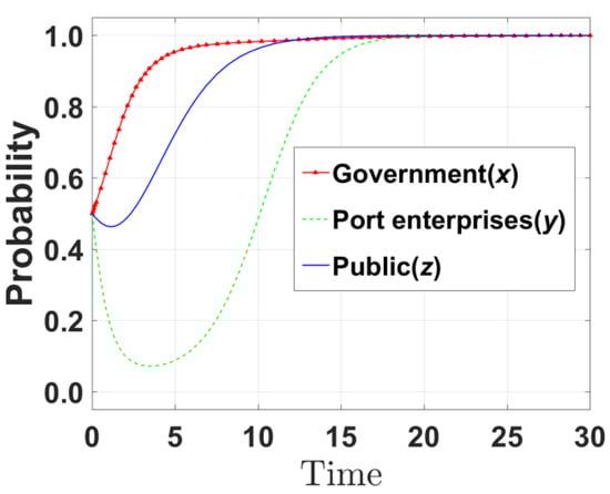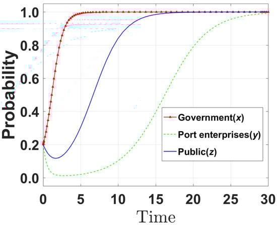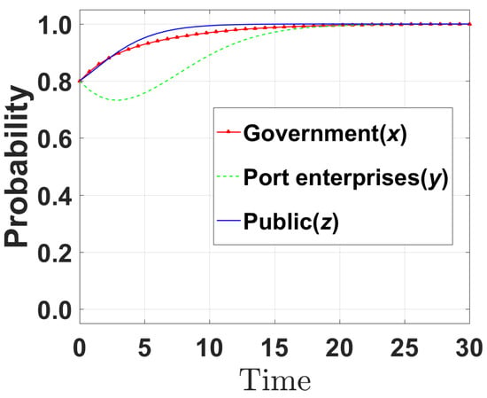 The probabilities of the three initial strategies were set to [0.2, 0.2, 0.2], [0.5, 0.5, 0.5], and [0.8, 0.8, 0.8]. The initial likelihood of the government selecting incentive strategies was set at 0.2, 0.5, and 0.8. Similarly, the initial probabilities for businesses to adopt emission reduction strategies and for the public to exercise supervision strategies were also specified as 0.2, 0.5, and 0.8. The simulation diagrams of the initial state at the equilibrium point (1,1,1) are shown in Figure 2, Figure 3 and Figure 4. Based on these diagrams, various parameters were changed, and the influence mechanism among various factors was studied. When the initial probability of all three parties was set to 0.2 (Figure 2), the probability (y) of port enterprises choosing an emission reduction strategy quickly converged to 1 after t = 18. This scenario suggests that the low initial willingness to participate leads to cautious strategy adjustments of all parties, and it takes longer to promote system optimization through the feedback mechanism of policy incentives and public supervision. When the initial probabilities of all three parties were set to 0.5 (Figure 3), the probability (y) of port enterprises choosing to reduce emissions quickly converged to 1 after t = 10. When the initial probabilities of all three parties were set to 0.8 (Figure 4), the probability (y) of port enterprises choosing to reduce emissions quickly converged to 1 after t = 5. Such a scenario suggests that high initial willingness accelerates the transmission of policy effects, and enterprises respond to reduce emissions quickly due to dual pressures (government incentives and public supervision). However, some small- and medium-sized terminals at Ningbo-Zhoushan Port still rely on diesel power generation due to funding shortages. The model did not account for heterogeneity in enterprise scale, resulting in an overly optimistic prediction of the convergence speed results.