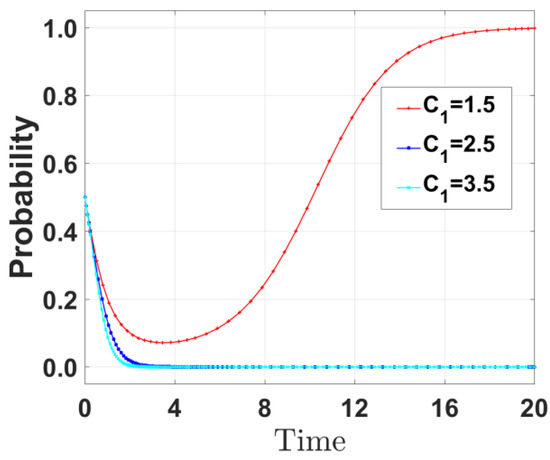 By varying the government’s special budget for environmental governance (C1) and increasing it to 2.5 and 3.5, respectively, the evolution path of the public’s strategies was derived and is shown in Figure 7. When C1 increases from 1.5 to 3.5, the probability of the public choosing oversight strategies decreases gradually. The benefits of the public’s oversight strategy mainly depend on whistleblower rewards and the health economic value, while the oversight cost is a fixed expenditure. The increase in the government’s incentive costs leads to the choice of nonincentive strategies, which in turn reduces the government rewards for the public’s whistleblowing on enterprises’ illegal emissions and lowers their willingness to oversee.