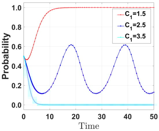 By varying the government’s special budget for environmental governance (C1) and increasing it to 2.5 and 3.5, respectively, the evolution path of the government’s strategy was derived and is shown in Figure 5. When C1 increases from 1.5 to 3.5, the probability of the government choosing incentive strategies decreases gradually. The reason is that the higher the C1, the greater the direct cost for the government to implement incentive policies. When the cost exceeds the expected benefits, the government tends to reduce incentives and instead chooses “no incentive” to save the budget.