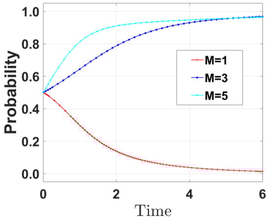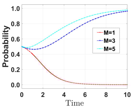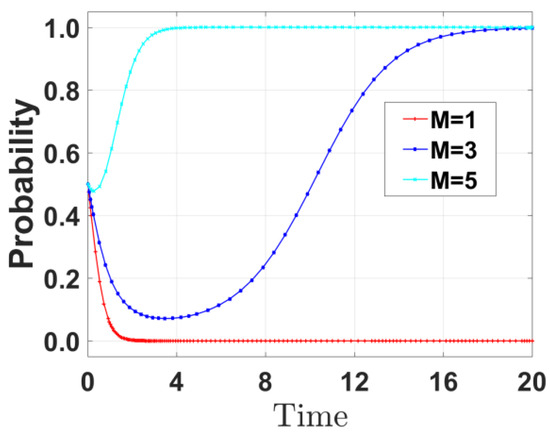 By varying the government fine M faced by port enterprises when they do not reduce emissions and reducing M to 1 and increasing it to 5, respectively, the evolution path of government strategies was derived and is shown in Figure 8. As M increases, the probability of the government choosing incentive strategies shows an upward trend. When M = 1, the government’s incentive probability quickly converges to 0; when M = 3, the incentive probability shows a slow upward trend; when M = 5, the incentive probability quickly rises to 1.