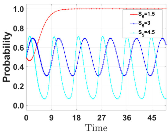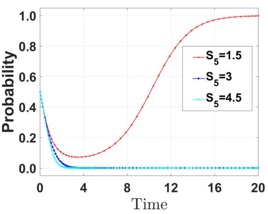 By varying the government reward S5 received by the public for reporting illegal emissions by enterprises and increasing S5 to 3 and 4.5, respectively, the evolution path of the public’s strategies was derived and is shown in Figure 13. When S5 is increased from 1.5 to 4.5, the probability of the public choosing oversight strategies decreases. When S5 = 1.5, the probability of the public overseeing is relatively high. As S5 increases to 3 and 4.5, the oversight probability fluctuates between 0 and 1.