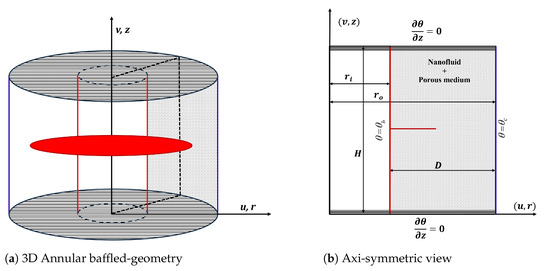 The annular portion is filled with an NF-saturated porous material, where silver (Ag) NPs are dispersed in as the base-fluid. The analysis assumes local thermal equilibrium between the NPs and the base-fluid. The flow is considered to be two-dimensional and laminar, with constant thermophysical properties except for density variabilities, which are accounted for using the Boussinesq approximation. The relevant thermophysical properties of both the NPs and are provided in Table 1. The thermophysical properties of NFs depend on the volume fraction of NPs and the properties of both the base-fluid and the NPs . Table 2 summarizes these properties with the corresponding mathematical models adopted in the current analysis, with the subscripts , f, and p denoting nanofluid, base-fluid, and nanoparticle, respectively.