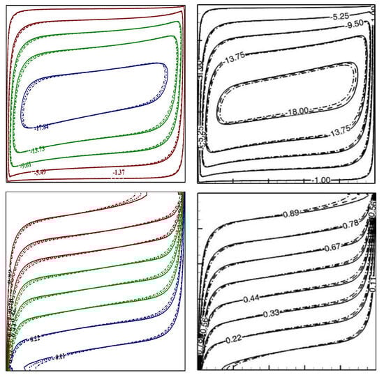 To validate the current simulation outcomes, in this section, we report several important trial simulations to compare, qualitatively as well as quantitatively, with standard benchmark predictions existing in the literature, which are illustrated through Table 3 and contour illustrations (Figure 2), to support the credibility of the in-house developed code. In this regard, first, we modified our code with uniform heating and cooling, without the presence of a baffle (), for a uniformly heated-cooled non-baffled annulus and square geometry. We performed simulations for a thermal-buoyancy-assisted convection and obtained the thermal transport rates for an annular geometry without baffle to compare with the quantitative predictions of Abouali and Falahatpishesh [4]. Our predictions in the annular conduit for different magnitudes of and are found to be in fair agreement with the numerical outcomes of Abouali and Falahatpishesh [4], as displayed in Table 3, with minimum allowable deviations.
