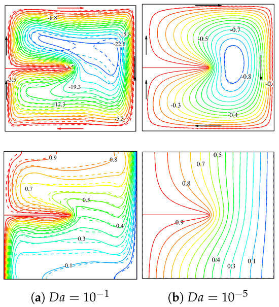 Darcy number influence on streamlines and isotherms for , , . Continuous and dotted curves, respectively, represent and (the arrows in the upper figures highlight the direction of the vortex rotation in the annulus).