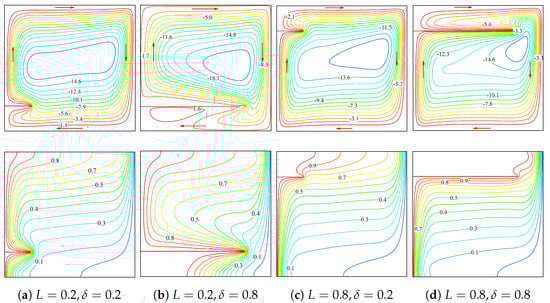 The analysis of the influence on the flow features and thermal patterns reveals compelling insights into porous material behavior, as illustrated in Figure 4. At a higher Darcy number , manifesting enhanced permeability, the NF flow exhibits complex patterns characterized by dual circulation cells and pronounced flow distortions, particularly near the boundary regions. The corresponding isotherm contours exhibit strong clustering, indicating the presence of steep thermal gradients across the domain. The impact of different porosities ( and ) becomes significant at this higher Darcy number, with higher porosity resulting in more intense circulation patterns. In contrast, at a lower Darcy number , indicating reduced permeability, the flow structure shows simpler patterns, characterized by a single primary circulation vortex, and the thermal distribution shows a higher uniform spacing and smoother transitions. The influence of porosity variation becomes less pronounced at this lower Darcy number, indicating that permeability effects play a dominant role over porosity impacts. The influence of the baffle dimensions and locations on the flow and thermal patterns within the porous annular region is reported in Figure 5. Four distinct baffle configurations are analyzed, characterized by varying different combinations of L and dimensions. For the case of , denoting a shorter baffle positioned closer to the bottom, the flow field exhibits a primary circulation pattern with densely positioned streamlines, while the isotherms show moderate thermal stratification. However, for but increasing to (shifting the baffle to a higher location), a notable alteration in the flow structure occurs with a more pronounced distortion in the streamlines adjacent to the baffle region, accompanied by enhanced thermal mixing, as evidenced by the isothermal patterns. For configurations with longer baffles , the flow and thermal characteristics exhibit larger significant variations. At , the extended baffle creates a more restricted flow passage, causing strong flow circulation rates in the restricted region and more pronounced thermal gradients. The case of shows intense flow modification, with different flow separation and recirculation zones, along with sharp thermal gradients, particularly near the baffle edge.