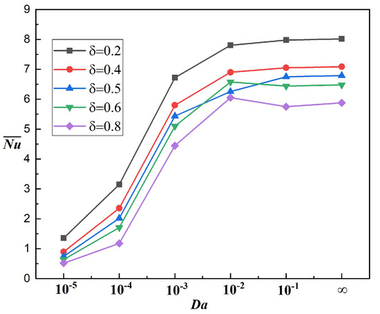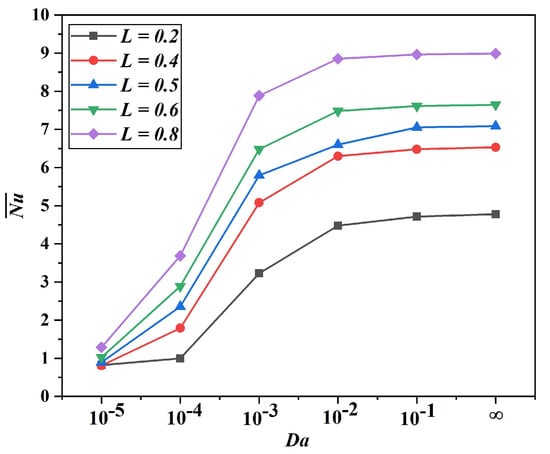 Figure 6 illustrates the thermal efficiency relationship between the average and the Darcy number for various fin positions . The thermal performance predicts a clear physical trend, indicating at low Darcy numbers () that the flow drag is severe, and the heat transfer is primarily conduction-dominated, resulting in low across all fin positions. As the increases, particularly between and , a drastic enhancement in heat transfer due to stronger convective effects occurs. The fin position closer to the bottom consistently records superior thermal performance, achieving a maximum Nusselt number. This superiority can be attributed to better utilization of the buoyancy-driven flow, as the lower fin position allows for more effective development of thermal boundary layers and convective currents. Conversely, higher fin positions show reduced thermal efficiency, suggesting that placing the fin at higher locations impedes the BDC flow pattern. The variation in the average curves indicates that further increase in permeability beyond produces minor variations in heat transfer enhancement. The interplay between the baffle dimension () and Darcy number () on heat transfer effectiveness is reported in Figure 7. An overview of the predictions suggests that shorter fins () consistently outperform longer ones, achieving the highest thermal transfer (). This superior performance of shorter fins could be attributed to reduced flow blockage, as seen in a longer baffle, permitting better fluid circulation and hence enhanced convective thermal transport. As the baffle dimension increases to , the thermal performance deteriorates due to higher flow resistance, which leads to reduced convective mixing. The influence of permeability () follows a characteristic pattern. At low (), conduction dominates and heat transfer is minimal across all fin lengths. A sharp enhancement in thermal transport occurs between and , marking the transition from conduction- to convection-dominated regimes. Beyond , the variation in the curves stabilizes, suggesting that further increases in permeability provide minimal thermal benefits.