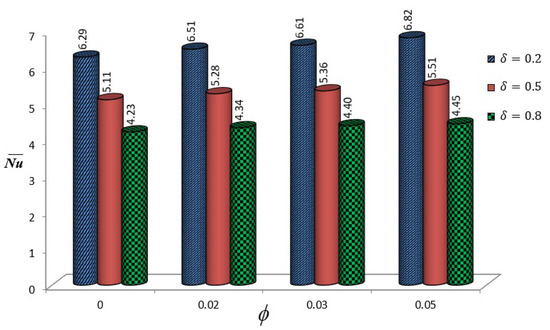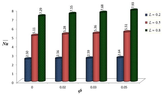 Figure 8 demonstrates the collective impacts of the fin length () and position (L) on the thermal efficiency for the fixed parameters (, , , ). For the combinations of shorter fins () and lowered positions (), the heat transfer performance is predicted to be superior, with around . However, as the baffle position increases to , an increase of in the average could be achieved. In addition, it could be observed that the performance differences between various fin dimensions become less pronounced, with all curves converging to Nusselt numbers around 8.5–9 for the elevated baffle location (). The lower fin lengths consistently outperform larger dimensional baffles across all fin locations, attributed to better utilization of the developing thermal boundary layer and convective currents near the bottom portion of annular domain. The effects of the NP volume fraction () and fin length () on thermal transport performance are reported in the bar graph (Figure 9) at , , , and . The parametric analysis elucidates that shorter fins () consistently demonstrate superior thermal transport, with Nusselt numbers ranging from to across all NP concentrations. A moderate increase in heat transfer is observed with an increasing NP volume fraction, particularly for , where increases from () to (). However, this enhancement becomes less pronounced for longer fins (), where values remain relatively lower (around 4.2–4.5). To consolidate the outcomes from these predictions, it may be suggested that the combination of shorter baffles with high-density NPs could enhance the thermal transport among other combinations.