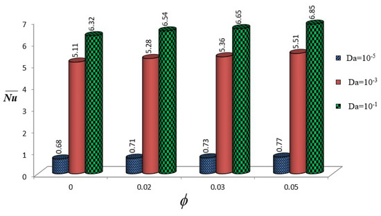 Figure 10 reports the combined influences of the NP volume fraction () and fin location (L) on the thermal transfer characteristics at , , , and . Fins positioned at exhibit significantly enhanced heat transfer, with Nusselt numbers ranging from to across all NP concentrations. The addition of NPs shows a modest positive impact on heat transport, with the most pronounced enhancement observed for , where increases from () to (). However, fins positioned closer to the upper portion of the annular domain () demonstrate consistently lower heat transfer rates (), suggesting that positioning fins too close to the upper boundary restricts fluid circulation and thermal mixing. The intermediate fin position () shows moderate performance, indicating optimal baffle placement is crucial for maximizing the combined benefits of fin-enhanced heat transfer and NF properties. The numerical predictions in Figure 11 demonstrate the interplay between and on thermal efficiency at and . As expected, higher magnitude of () yields substantially enhanced thermal transport rates, with average ranging from to , indicating augmented fluid permeability and consequently, higher convective transport. A moderate increment in the heat transport is observed with an increase in NP concentration across all Darcy numbers. However, for the low permeability case, (), the thermal transfer remains notably suppressed ( despite increasing NP concentration, suggesting that the flow constriction dominates over the enhanced thermal conductivity impacts of NPs. The intermediate permeability case () shows moderate heat transfer enhancement, highlighting the critical role of porous media permeability in determining the effectiveness of NP addition.