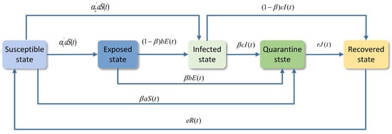 Nodes in the infected state (I) have been severely affected by disruption risks. At this stage, the supply chain’s self-response and recovery mechanisms begin to take effect, leading these nodes to transition to the recovered state (R). However, some nodes may also be proactively identified through risk detection and moved into the quarantined state (J). So, infected nodes (I) transition at total rate c, with to J and to R, while receiving inflows from S and E at rates and , respectively.