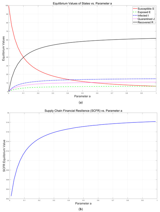 (a) Impact of a on the equilibrium point of each state. (b) Impact of a on the stabilizing values of supply chain financial resilience.